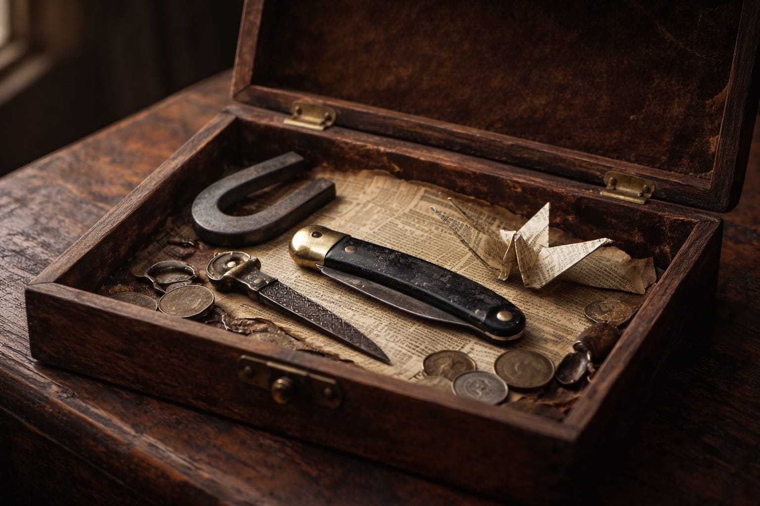 Entre los juguetes antiguos que más me fascinan: la gumía, el cris, el cuchillito de monte… y la navaja. Todos de acero, todos muy pequeños. Me pregunto muchas veces quién los compraría, dónde y para quién. La tía solo me deja jugar con la navaja. Ha limado el filo y la punta.